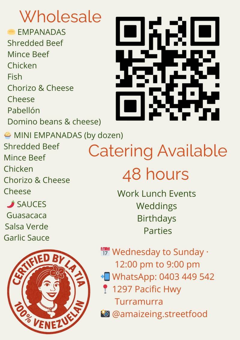 Get your fix of the best empanadas in Sydney, Australia! Amaize-ing offers a delicious selection of authentic Venezuelan flavours, delivered straight to you. Easy ordering, tasty meal deals and unbeatable flavour awaits! 48 hours in advance required for any catering order.